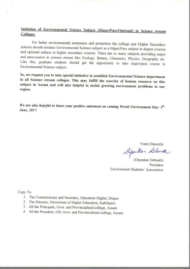 If in all the colleges and higher secondary sections of Assam, a particular department can be established to provide the knowledge to the students then we may be benefitted by two ways- a) students will be environmentally educated and will be inspired to protect all the aspects of environment both scientifically and practically, b) Environmental Science degree holders will get proper employment.